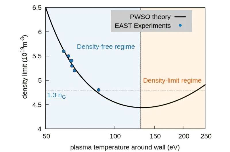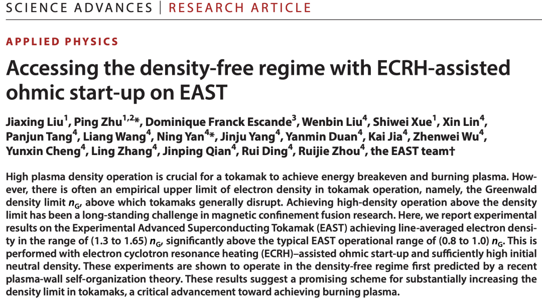该发现证实了托卡马克中密度自由区(density-free regime)的存在,成功突破密度极限,为聚变点火提供了新的路径。