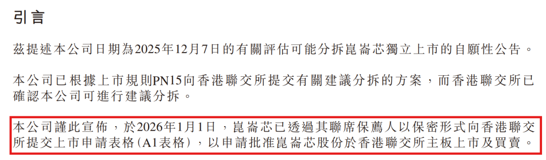 根据百度最新公告,昆仑芯(北京)科技股份有限公司(全文简称昆仑芯)已于2026年1月1日以保密方式向港交所提交了主板上市申请。