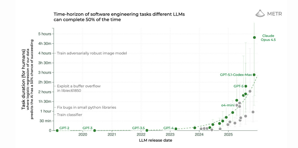 该图表展示了人类需要花费长达 5 小时才能完成的任务,并绘制了能够独立达成相同目标的模型演进过程。可以看到,2025 年在这一维度上出现了巨大的跃升,GPT-5、GPT-5.1 Codex Max 以及 Claude Opus 4.5 已经能够完成需要人类数小时才能完成的任务,而 2024 年的最强模型仍停留在 30 分钟以内。