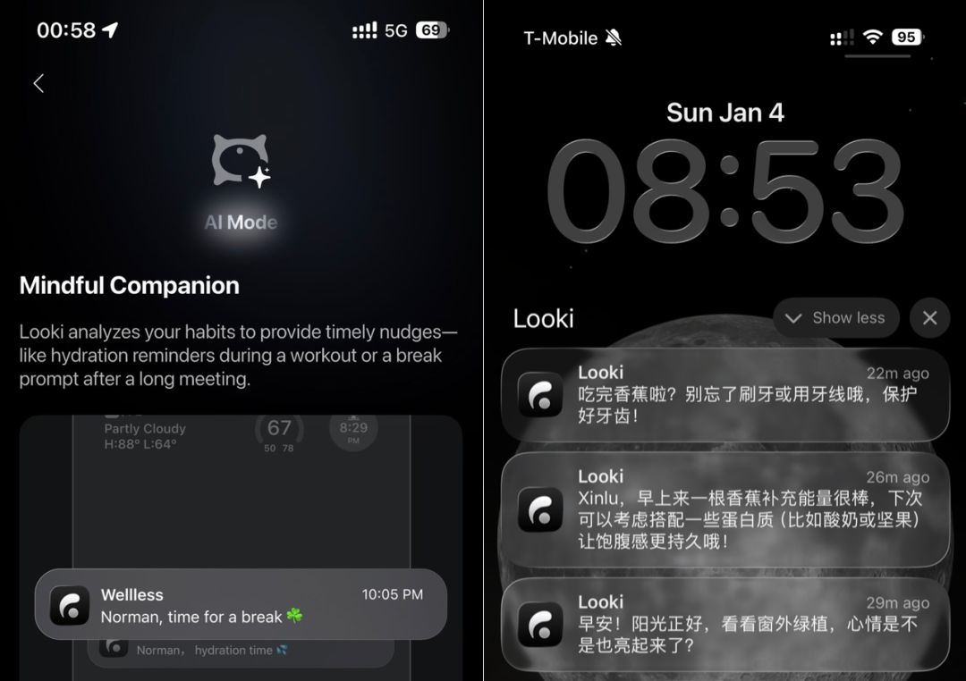 但接下来,Looki 在充分了解用户,甚至可以实时理解用户此时此刻正在做的事情之后,它可以更加主动地给用户提供信息、提醒乃至关心。Looki 称之为「场景自适应式智能」(Scene-Adaptive Intelligence)。