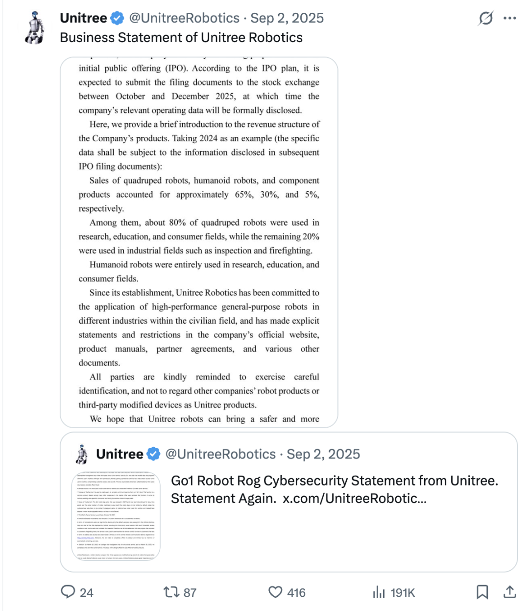 2025年9月2日,宇树发表声明称: