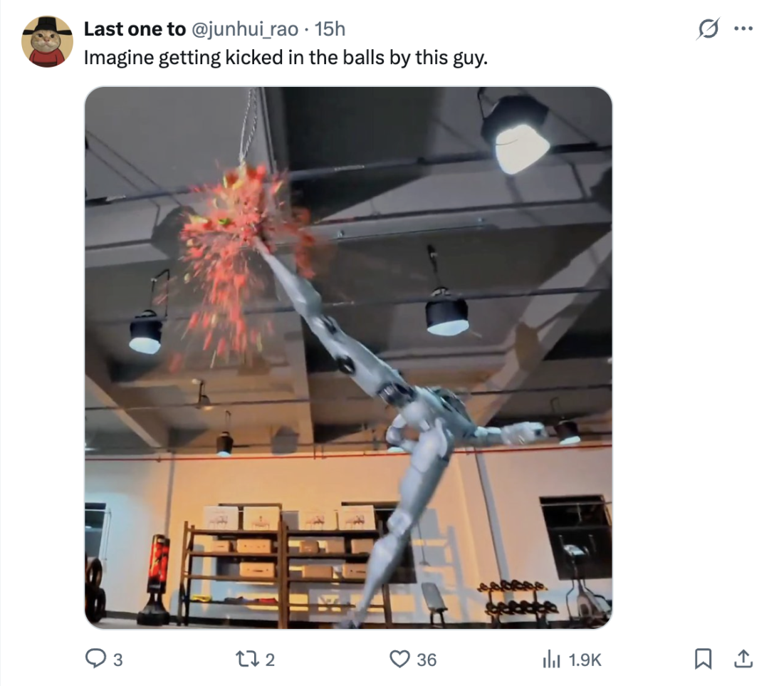 视频里机器人又是飞踢,又是倒挂金钩,踢沙袋,西瓜的。