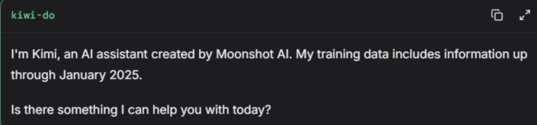 发现这个新模型的推特网友询问了模型的身份,结果模型自报家门,表示自己来自月之暗面Kimi,训练数据截止到2025年1月。