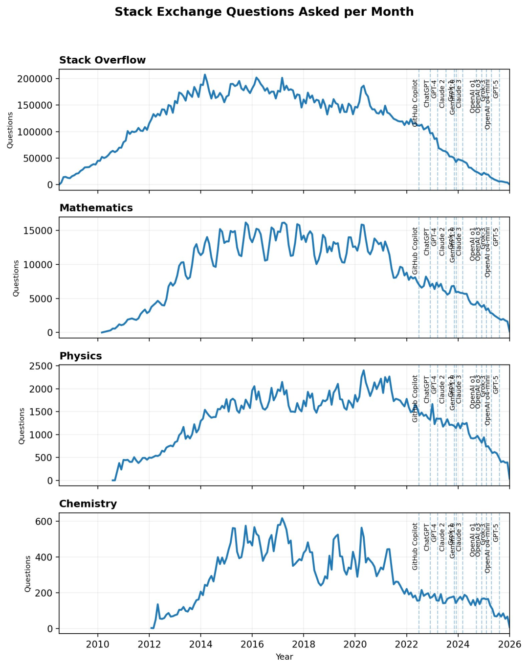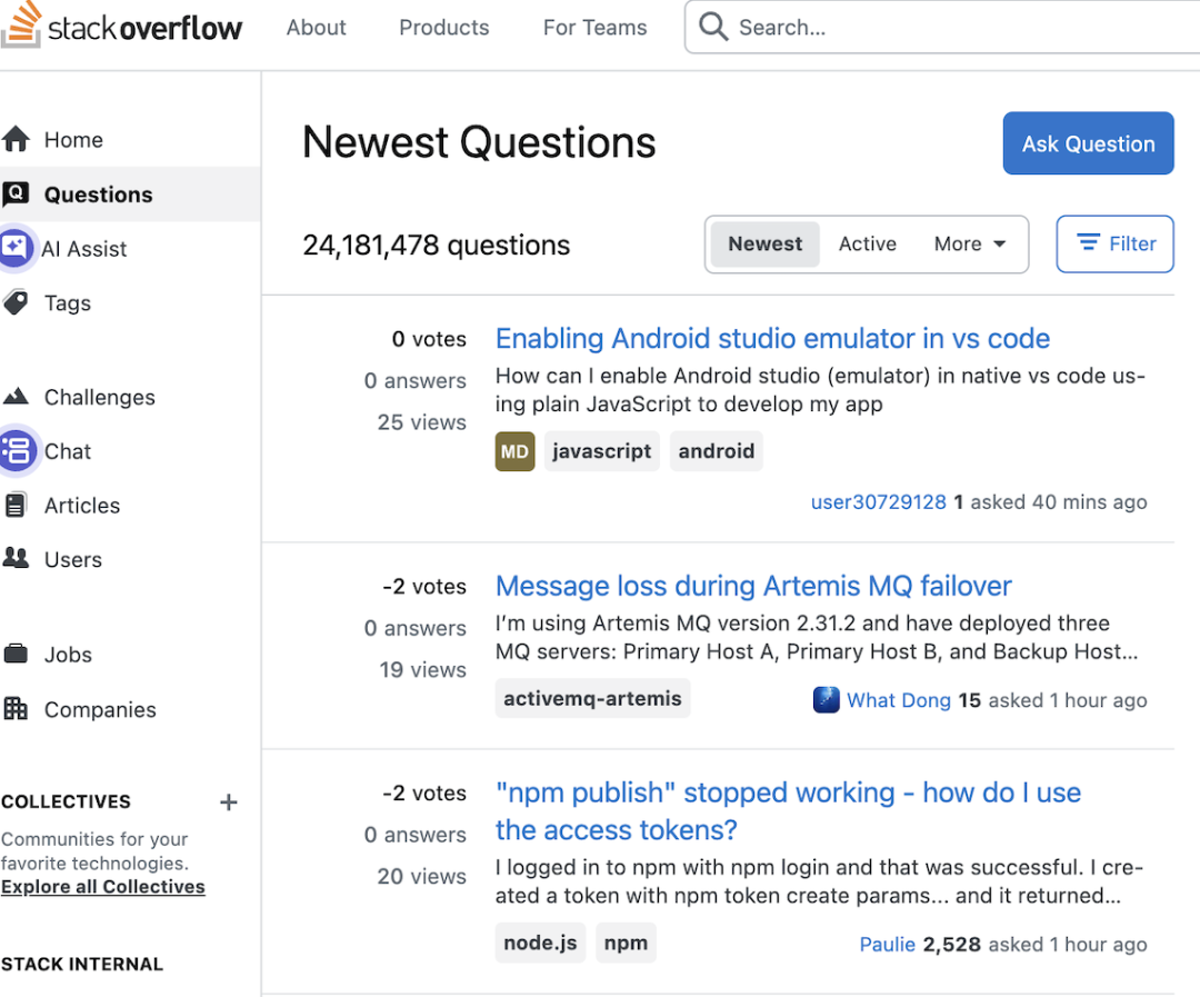 从数据来看,Stack Overflow的问答数量一路下滑,直到如今跌破18年前的起点,在这其中,AI真得背锅。