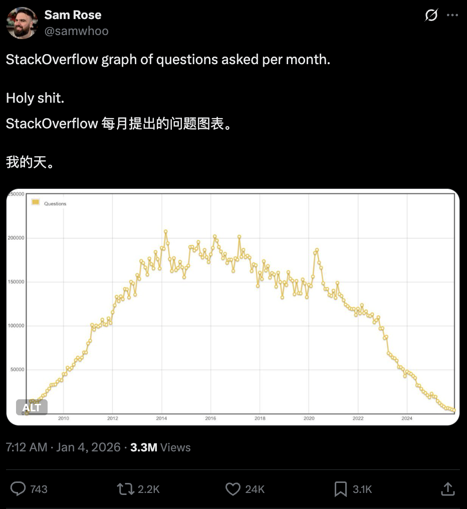 Stack Overflow变成了“被自己创造的知识反向替代的平台”。