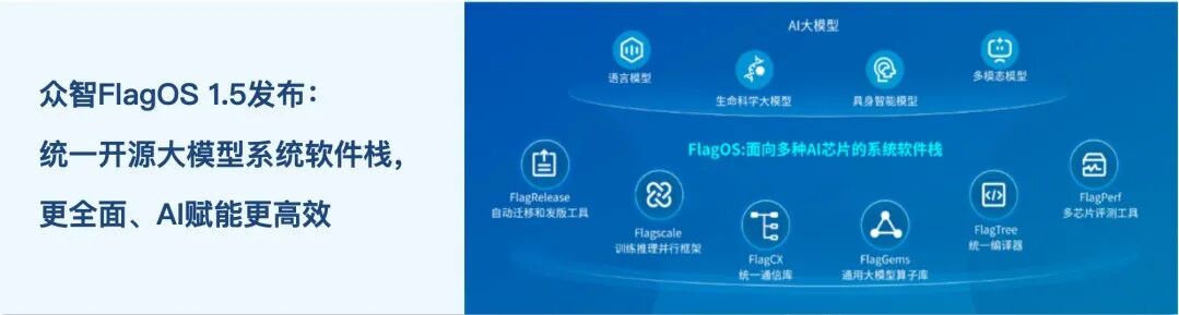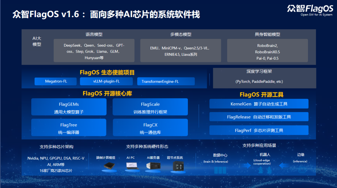 为了应对这样的技术新趋势,众智FlagOS专注于加快生态使能、深化架构感知、加速AI赋能的创新,推出FlagOS 1.6 为开发者提供更易适配、更高性能、更快迭代的一体化工具链,同时支持具身智能模型研发,推动AI开发模式从“适配硬件”转向“模型创新”。