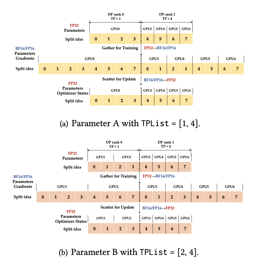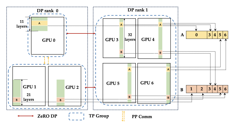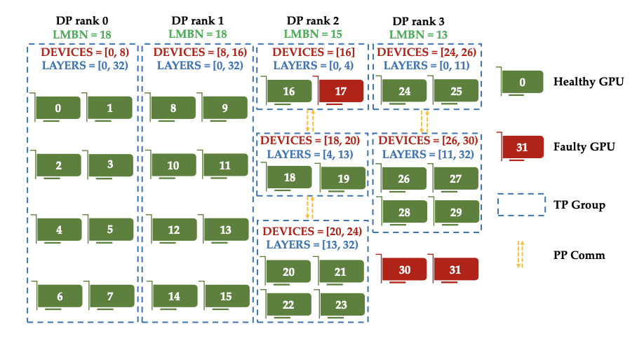 异构模型并行(HMP, Heterogeneous Model Parallelism):当某些GPU失效时,系统仍能用剩余GPU继续训练。HMP允许不同DP rank内的TP组大小不一致,并在此基础上组织PP阶段与通信组,从而适配“非整除”的GPU数量。