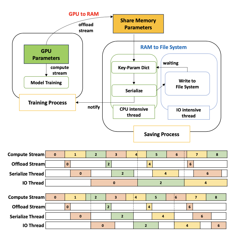 高效保存/加载与重叠(Overlapping Training & Checkpointing):保存过程被拆成GPU→CPU内存与CPU内存→文件系统两段,通过共享内存与多进程/多线程把参数搬运、序列化(Safetensors)和写盘解耦,并与训练计算流并行执行,尽量把检查点成本“藏起来”。加载阶段则通过重排与合并I/O,把大量小I/O尽可能合并为更少的顺序读取,降低共享文件系统上的开销。
