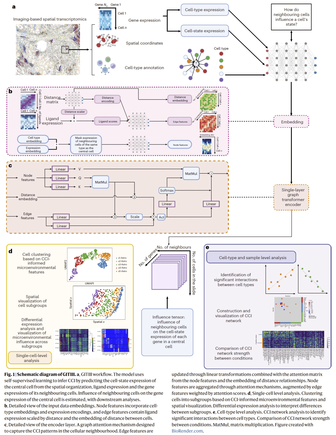 细胞—细胞相互作用(CCI)是组织发育与器官功能维持的核心机制。尽管成像型空间转录组技术使单细胞分辨率的 CCI 研究成为可能,但现有分析方法仍受限于配体–受体覆盖不足、空间信息利用不充分以及模型可解释性弱等问题。研究人员提出 GITIII,一种轻量、可解释的自监督图 Transformer模型,将细胞视为“词”,其空间邻域视为“上下文”,通过解析细胞状态与其生态位(niche)之间的相关性来推断空间单细胞层面的相互作用。GITIII 能量化邻近细胞对受体细胞基因表达的影响,实现空间 CCI 可视化、基于 CCI 的细胞亚群划分以及 CCI 网络构建。该方法在多物种、多组织、多平台的四个空间转录组数据集中成功揭示了大脑与肿瘤微环境中的关键相互作用模式。