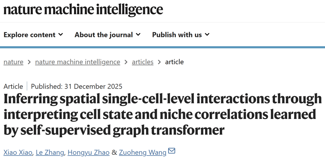 Xiao, X., Zhang, L., Zhao, H. et al. Inferring spatial single-cell-level interactions through interpreting cell state and niche correlations learned by self-supervised graph transformer. Nat Mach Intell (2025).