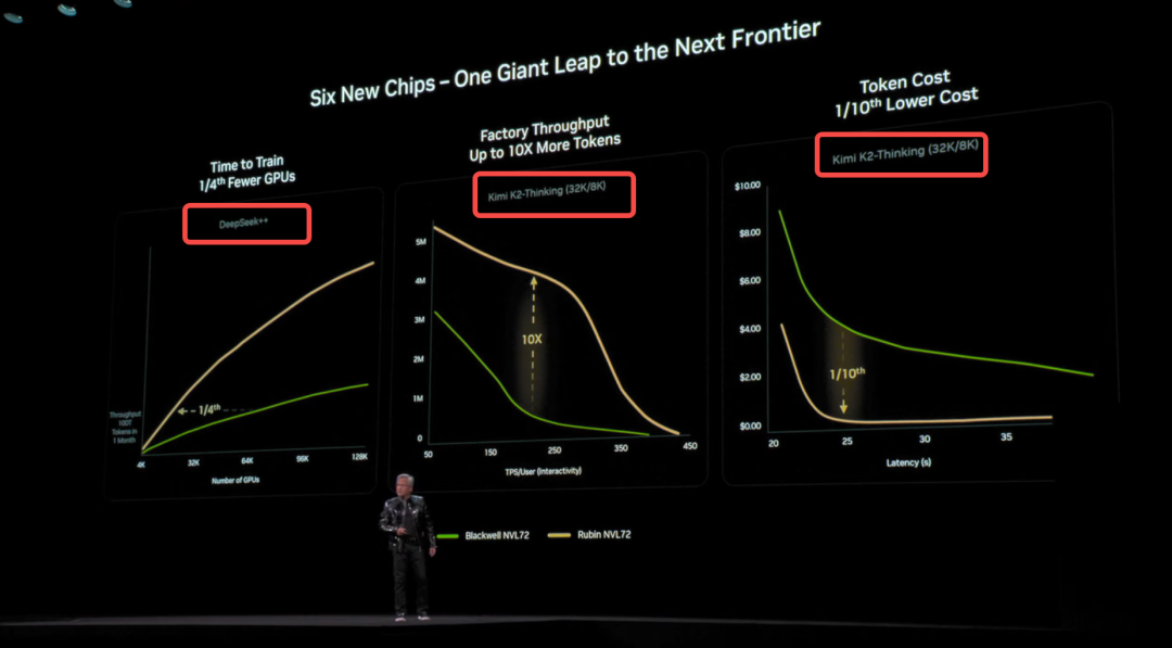 在下一代Rubin架构亮相的核心环节上,老黄还选用了DeepSeek和Kimi K2 Thinking来秀性能。