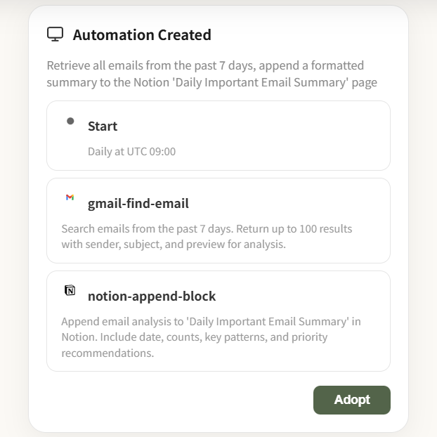 以前做这些事特别麻烦,每天只能手动处理,效率很低。他也试过 n8n、Zapier,都没解决问题。直到看到我们的产品演示,他觉得这就是他想要的形态,不用复杂操作,只要说明每天要做的事、同步到 Notion 和 Google 日历,我们的产品就能自主推理、调用他的工具,串联成一个完整的工作流。只要再加上一个「每天 9 点运行」的触发器,整个流程就能完全自动化了。