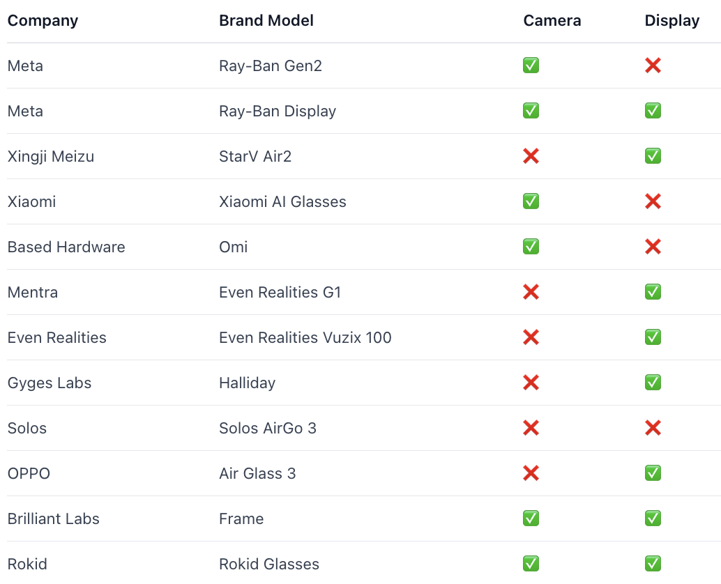 第一轮筛选后,团队发现真正同时具备内置摄像头和集成显示屏的产品其实并不多,进入候选范围的主要只有Meta Ray-Ban、Frame,以及乐奇Rokid。