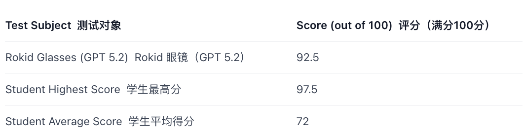 结果您猜怎么着?这款基于Rokid Glasses开发、搭载GPT-5.2模型的AI眼镜,在本次期末考试中拿下92.5分,成绩超过了95%的学生。
