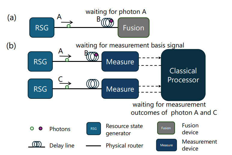 图4. 光子等待需求图解。在图(a)中,光子 B 需等待与其配对的光子 B 到达聚合设备,此后聚合操作方可执行。在图(b)中,光子 B 的测量基底依赖于光子 A 和 C 的测量结果,此时仍需等待经典处理器反馈以确定测量基底。