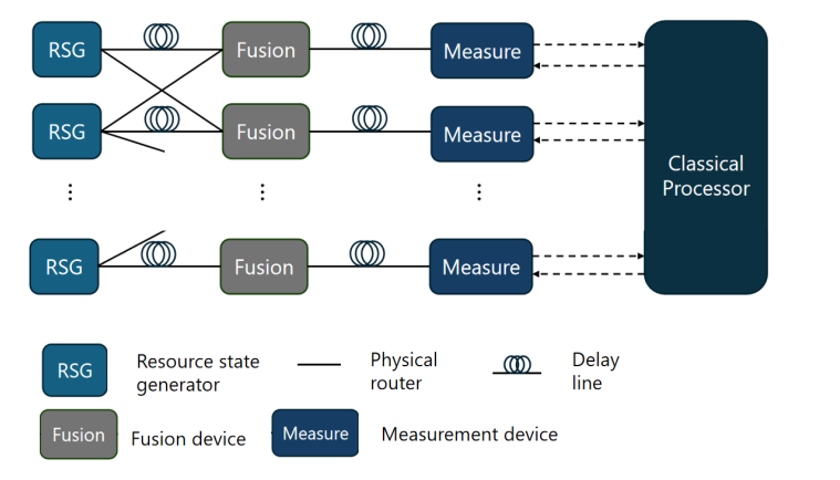 图1. 光量子计算平台上的 MBQC 实现方案。小型图态由资源态生成器(RSG)生成,通过部分光子的聚合(Fusion)操作聚合为大型图态作为计算资源,并通过确定基底(由经典处理器计算)的单量子比特测量驱动计算过程。