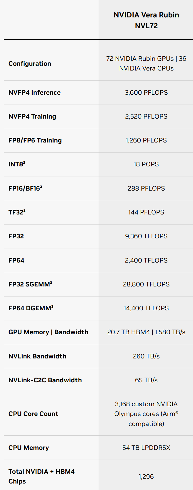 NVIDIA Vera Rubin NVL72 提供统一、安全的系统,集成了72 块Rubin GPU、36块Vera CPU、NVLink 6、ConnectX-9 SuperNICs和BlueField-4 DPUs