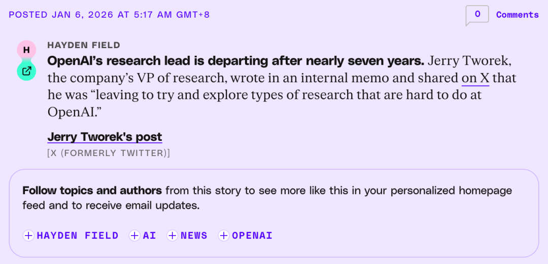 OpenAI研发副总裁Jerry Tworek正式宣布离职,结束了他在这家公司长达七年的征程。