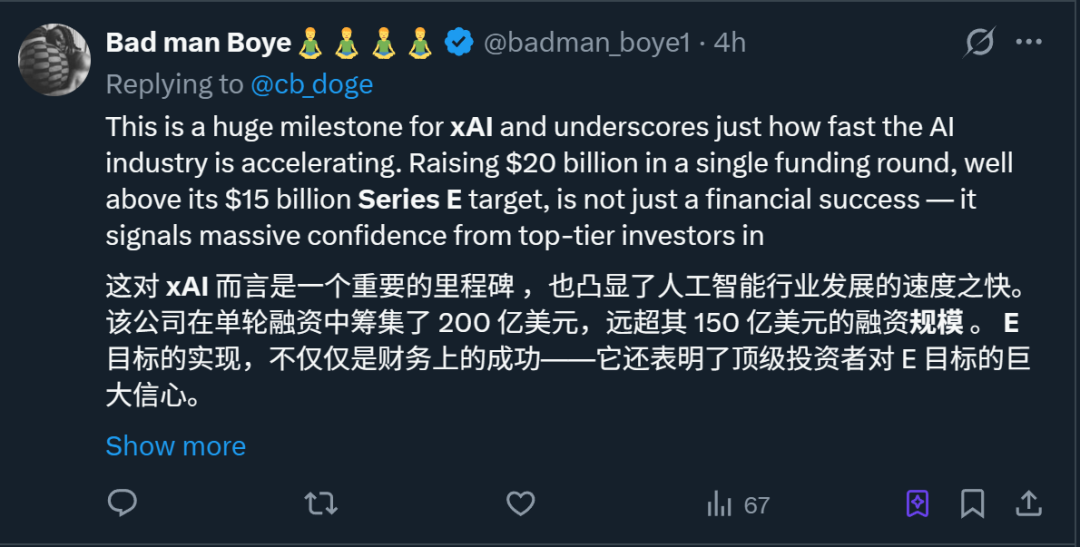 无怪乎有网友认为,这件事除了表明xAI财务上的成功,更重要的是彰显了AI热潮仍在继续。