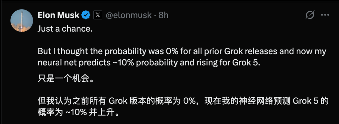 以前的Grok实现AGI的机率为0,但Grok 5至少有10%。