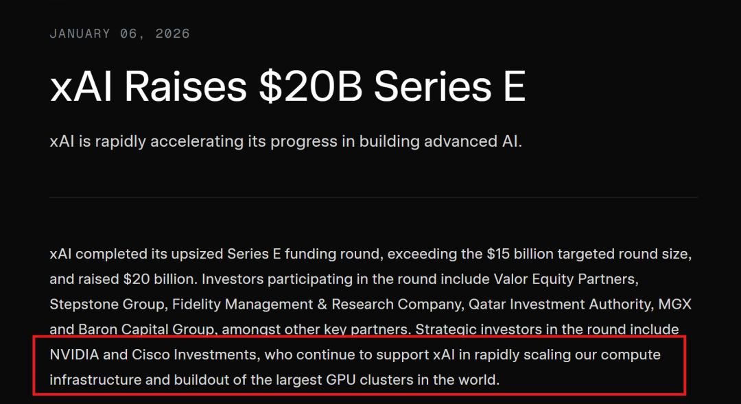 而且这次的E轮融资,英伟达和思科还都以“战略投资者”的身份继续支持老马。