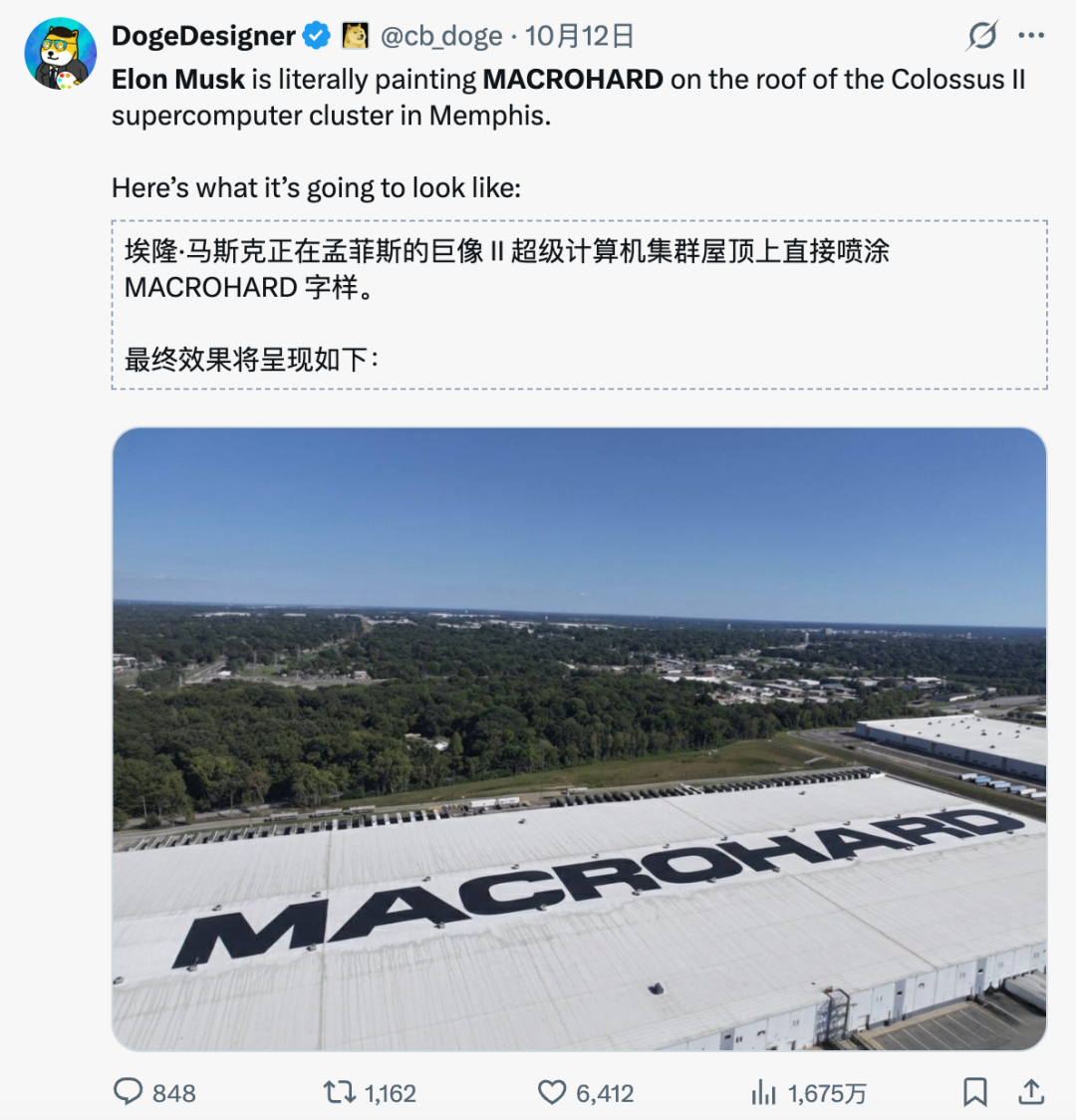 而在Colossus的屋顶上,马斯克让人刷上了巨大的「MACROHARD」标志。