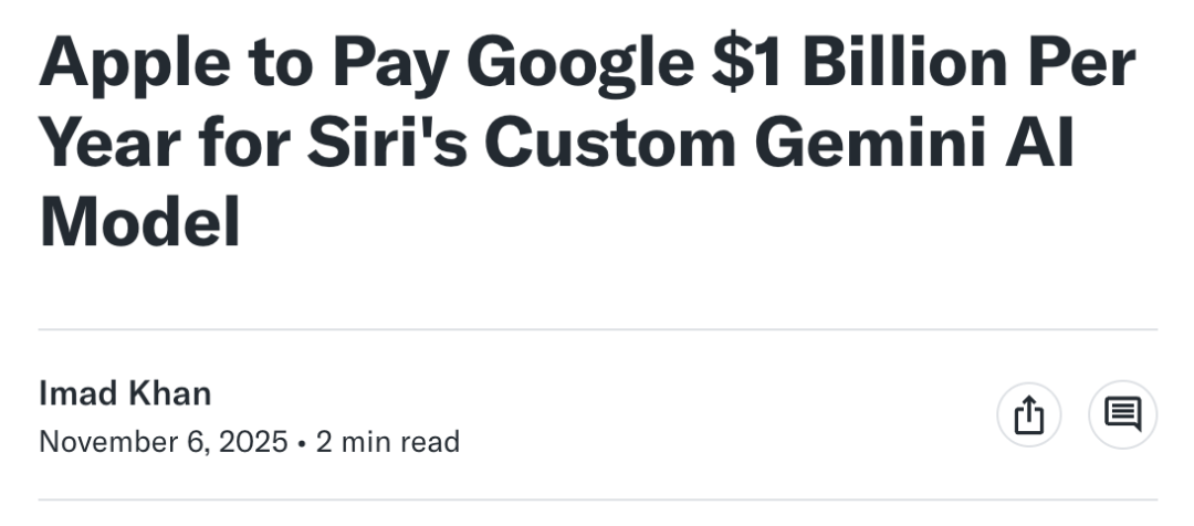 为了维持其在Search上的统治地位(每年已经向苹果支付200亿美元),谷歌愿意以「友情价」每年仅约10亿美元提供Gemini模型。