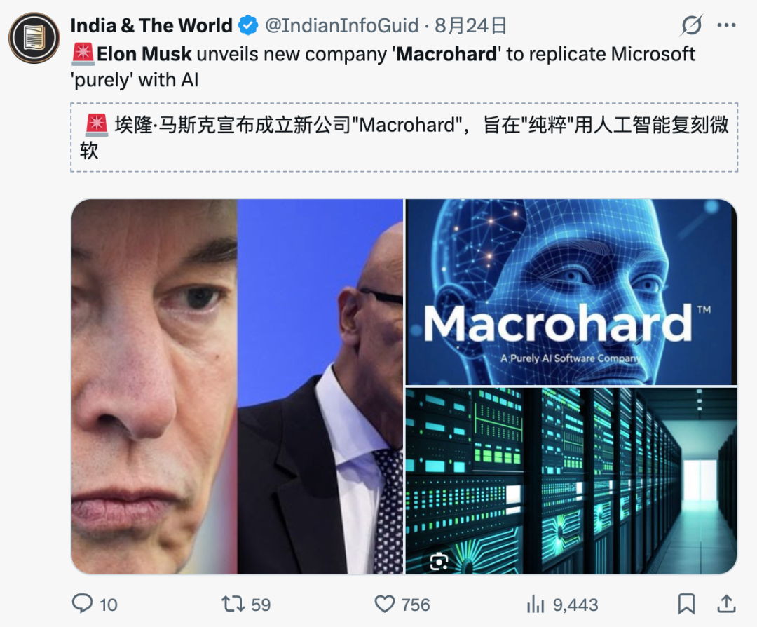 马斯克在X上宣称:「加入xAI,帮助建立一家纯AI软件公司,名叫Macrohard。这是一个玩笑的名字,但项目是非常真实的!」