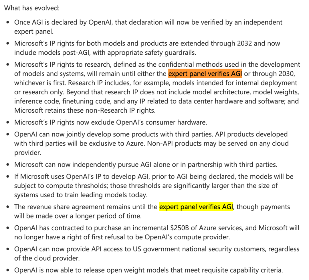 但纳德拉加了一个关键条款:AGI的定义不再由OpenAI单方面说了算,而是需要一个「独立专家小组」来验证。