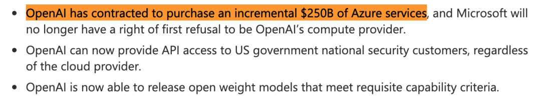 作为放弃计算排他权的交换,OpenAI承诺在未来几年内额外购买价值2500亿美元的Azure服务。