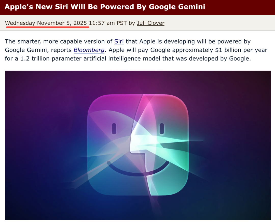 如果说微软和OpenAI之间的关系还有一些互相尊重的话,那么苹果(Apple)和谷歌在2025年的关系,则更像是一场屈辱的「城下之盟」。