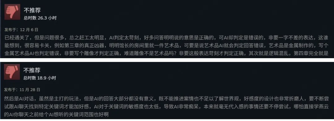 抖个机灵企图跳关,要能成功就会牺牲解谜体验;绞尽脑汁反复尝试,感觉答案大差不差,若失败必然吐槽人工智障,即便成功也不够有成就感,更何况重心往往是看剧情发展。