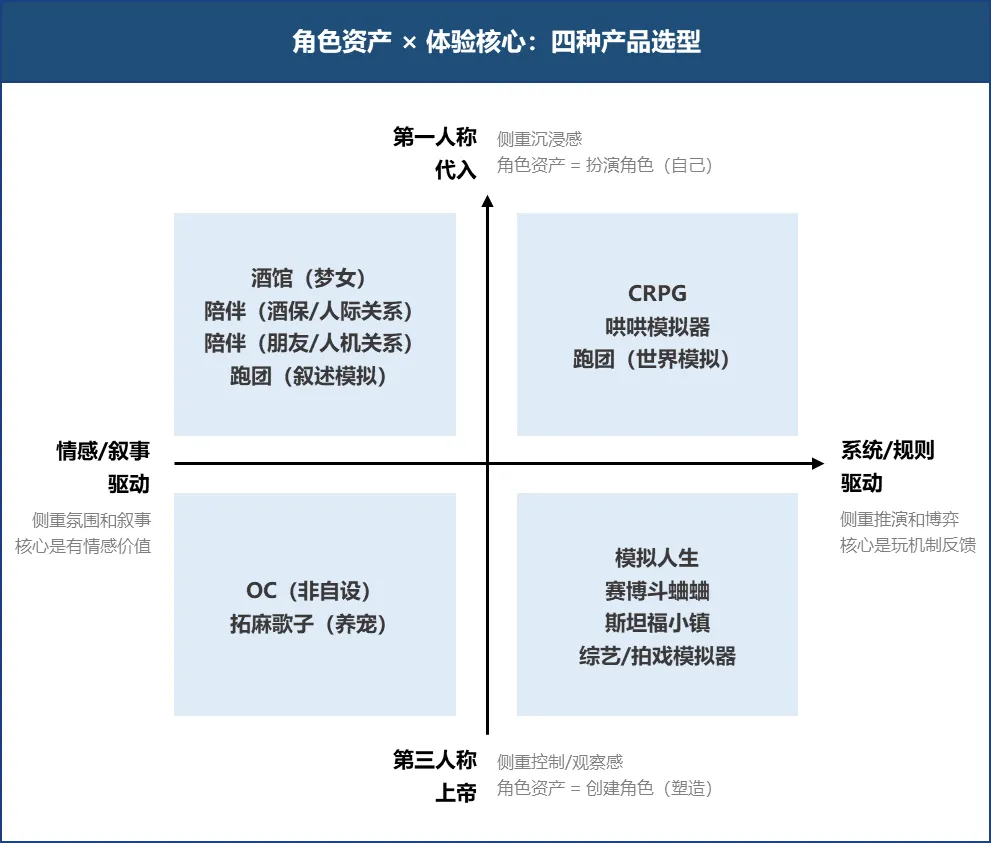 另一方面,生成体验由侧重游戏机制的规则/系统驱动,还是由侧重情绪氛围的叙事/情感驱动。当然,象限并非固定,用户状态也会流动,就像捏个 OC 后,能一起下本跑团,也能陪伴倾诉。