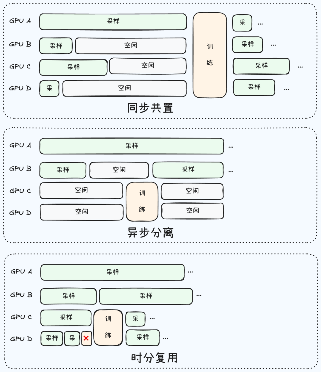 共置方案采用严格的串行执行策略:所有 GPU 首先统一投入 rollout 阶段,等待全部样本采样完成后再切换至 training 模式。这种方案存在双重效率问题。首先是阶段内的资源闲置:在 rollout 阶段,由于落后者效应的存在,大量 GPU 在短样本完成后进入闲置等待状态,无法有效利用。其次是阶段间的严格串行限制:rollout 和 training 完全无法并行执行,training 阶段必须等待 rollout 完全结束才能开始,导致整体迭代时间被显著拉长。