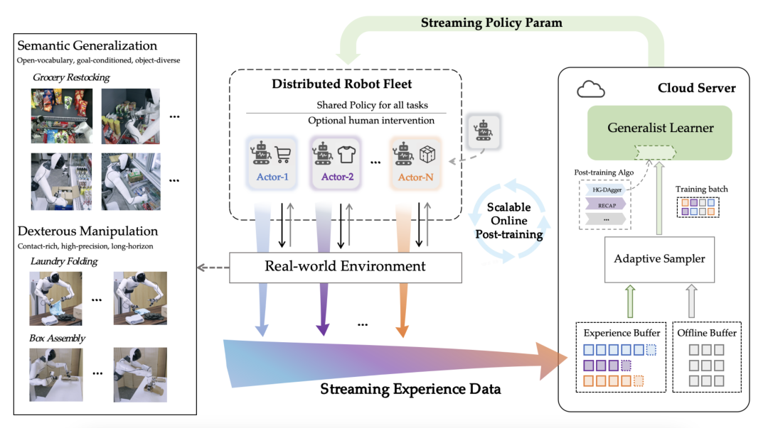 这是业界首次在物理世界的VLA后训练中,系统性地融合在线学习、分布式架构与多任务通才性,使机器人集群能够在真实环境中持续进化,让个体经验在群体中高效复用,从而将“规模”转化为“智能”。