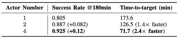 在总训练时间为3小时的限制下,四机进行学习的最终成功率达到了92.5%,比单机高出12%。