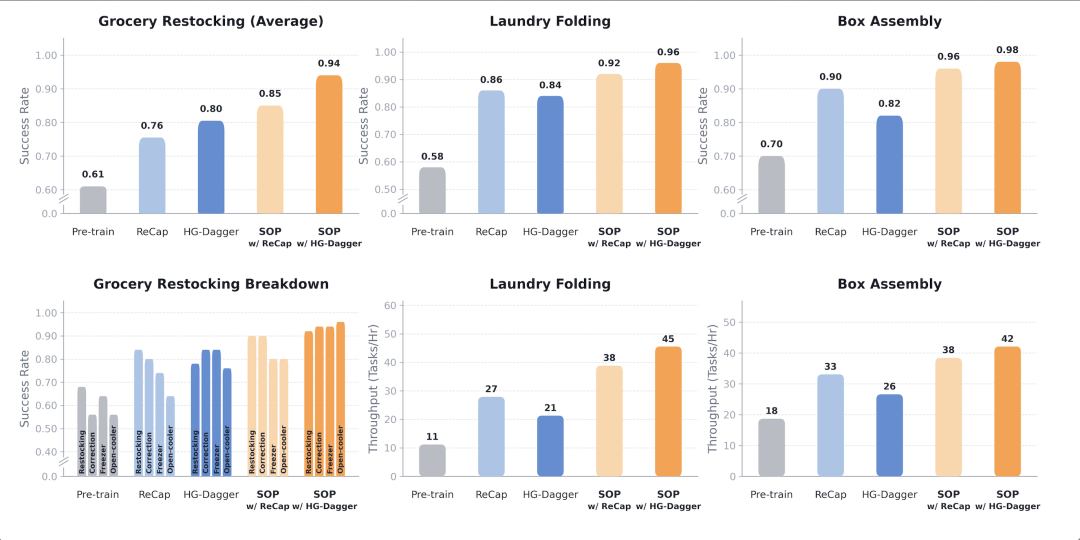 SOP让多任务通才的性能普遍提升至近乎完美,不同任务的成功率均提升至94%以上,纸盒装配更是达到98%的成功率。