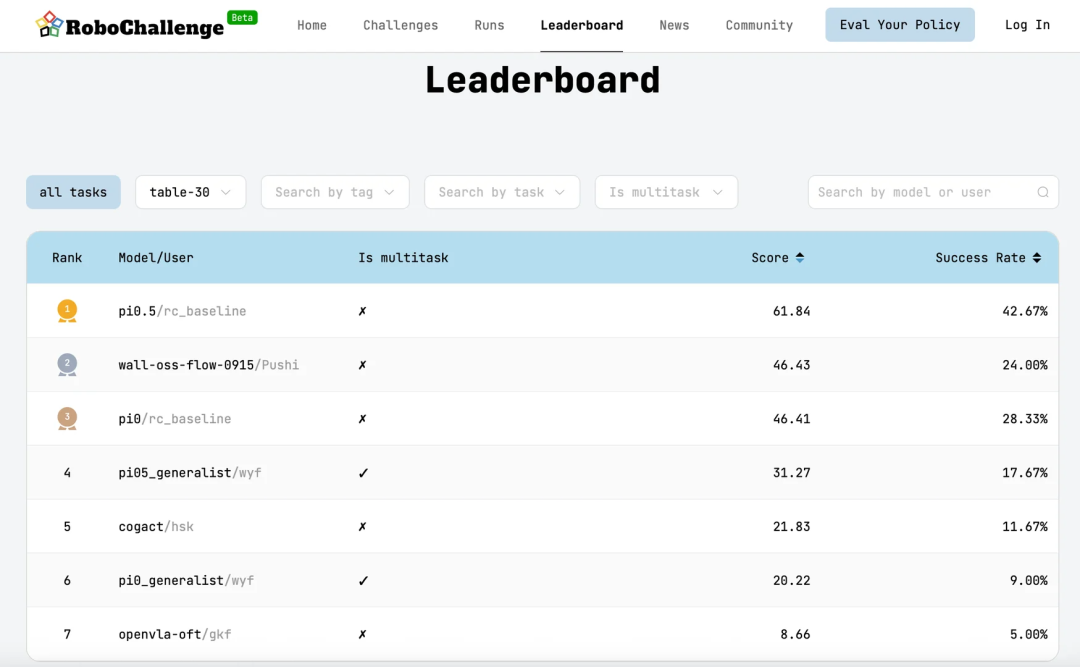 RoboChallenge首发的Table 30任务集,包含30个真实日常操作任务,而在行业常见的真机评测中,任务数量通常只有3–5个。