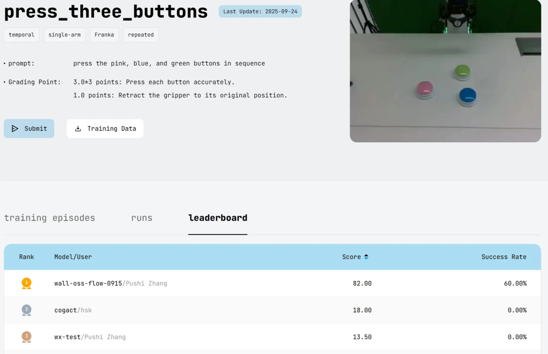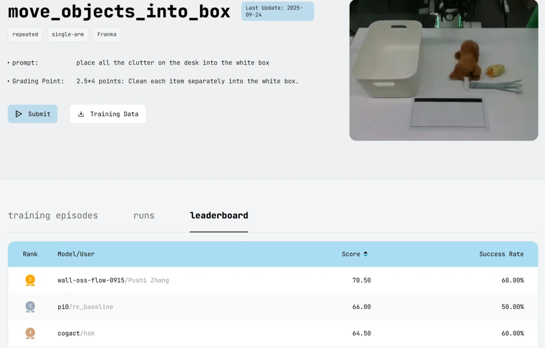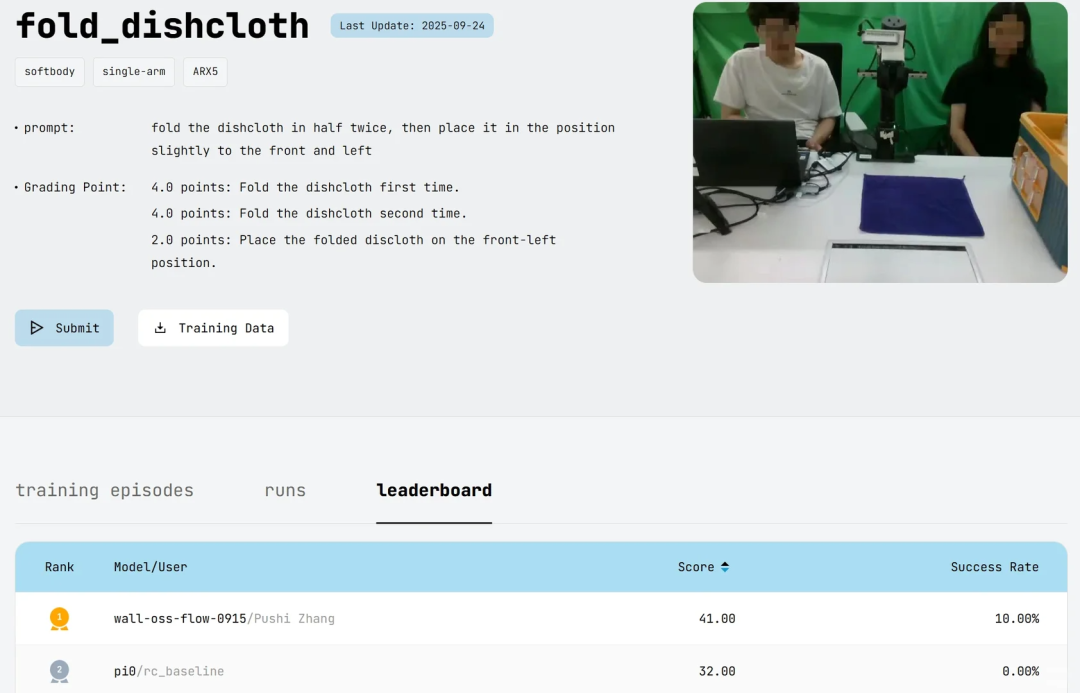 参赛方无需提交模型权重,只需提供可驱动机器人的算法;最终,平台通过统一的真机执行,以动作视频和任务完成率作为评分依据。