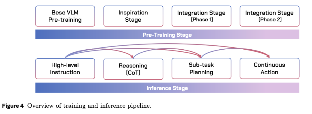 在训练策略上,WALL-OSS设计了“启发阶段(Inspiration)→整合阶段(Integration)”的阶段式范式。