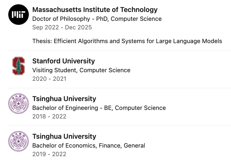2022年,肖光烜加入MIT攻读博士学位,导师为韩松(Song Han)教授。
