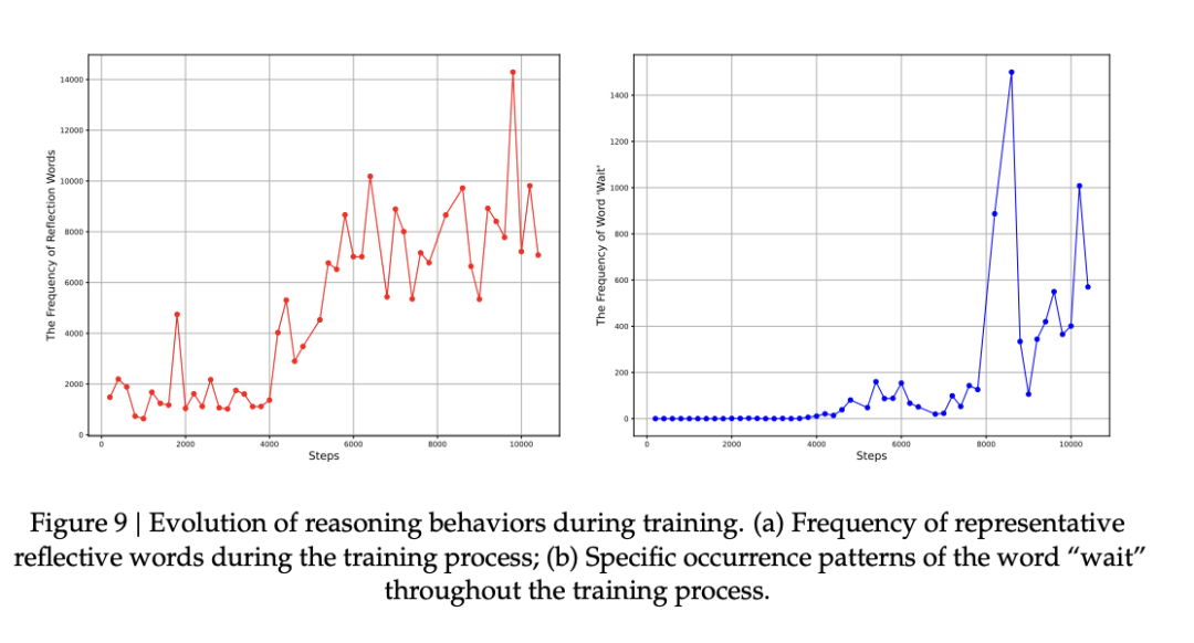 结果显示,随着训练推进,这些反思性词汇的出现次数,相比训练初期直接涨了大约5到7倍。