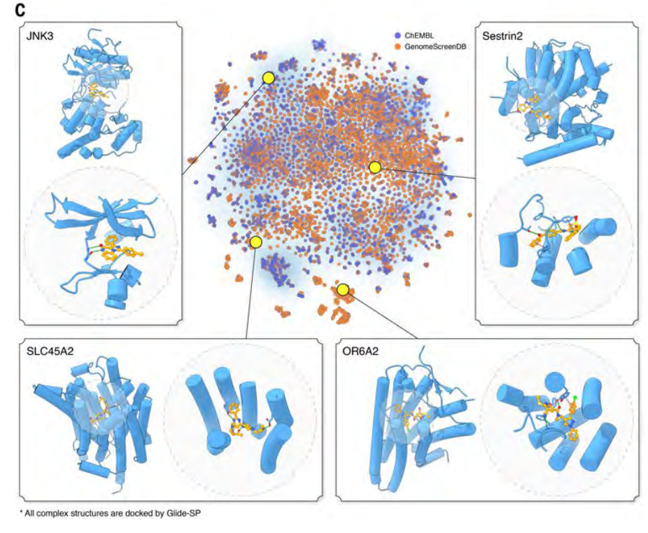 最终,他们构建了 GenomeScreenDB 数据库,覆盖近 1 万个人类靶点、2 万多个结合口袋,共收录 200 多万个潜在命中小分子。相关分子结构、对接构象及评分信息均已对外开放,开创了后 AlphaFold 时代药物研发新范式。
