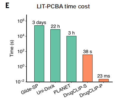 在对包含约 264 万个分子的 LIT-PCBA 数据集进行筛选时,传统分子对接软件 Glide-SP 需耗时约 3 天,而 DrugCLIP 在顺序计算模式下仅需 38 秒;在使用 GPU 并行计算时,完成相同计算量所需时间更仅为 0.023 秒。