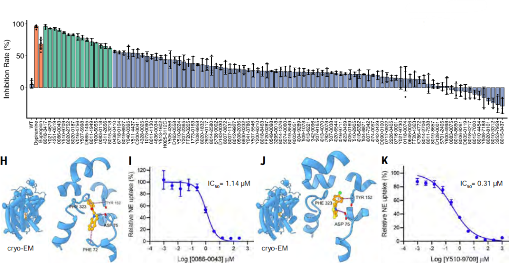 在湿实验中,DrugCLIP 针对去甲肾上腺素转运体取得了 15% 的命中率,并成功解析了两种筛选得到的抑制剂与靶蛋白的复合物结构。对于甲状腺激素受体相互作用因子 12(TRIP12)这一缺乏全配体结构和小分子结合物的靶点,DrugCLIP 仅依赖 AlphaFold2 预测结构便实现了 17.5% 的命中率。