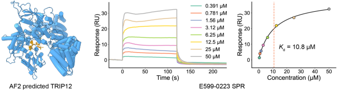 DrugCLIP 的价值不仅在于算力的飞跃,更在于其对全新靶点的硬核筛选能力。针对此前既无实验结构、也无已知抑制剂的“暗靶点”——人源 E3 泛素连接酶 TRIP12(与癌症和帕金森相关),DrugCLIP 直接基于 AlphaFold2 预测的蛋白结构进行盲筛,成功命中多个活性抑制剂。