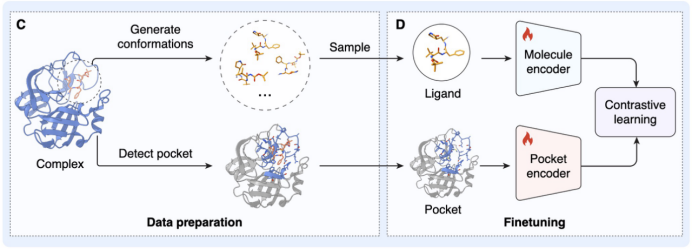 多尺度表征对齐:团队通过训练两个深度神经网络编码器,将蛋白口袋的 3D 拓扑结构与小分子的化学表征映射到同一个高维共嵌入空间(Joint Embedding Space)。