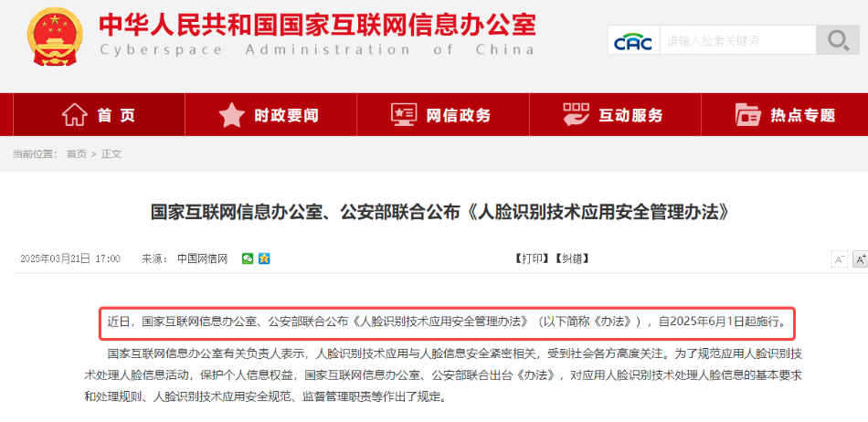 3月《人脸识别技术应用安全管理办法》由国家互联网信息办公室、公安部联合发布,对应用人脸识别技术处理人脸信息的基本要求、处理规则、安全规范、监督管理职责等作出规定。
