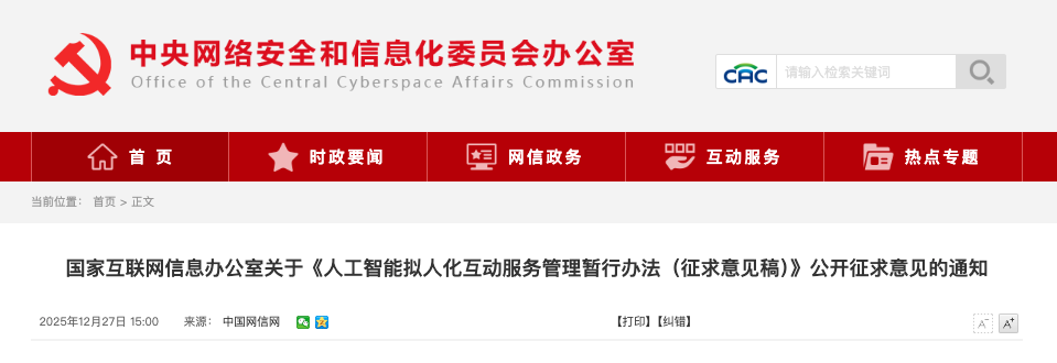 2025年12月,国家互联网信息办公室发布《人工智能拟人化互动服务管理暂行办法(征求意见稿)》,针对陪伴型机器人、虚拟偶像、AI助手等“拟人化”服务的监管新政,旨在保护用户情感健康。主体责任:要求提供者明确告知用户“正在与人工智能互动”,并禁止以替代社会交往、控制用户心理为设计目标。特殊保护:规定针对未成年人使用拟人化服务,系统需至少每隔3小时进行显著提醒,防止未成年人产生过度情感依赖或社交萎缩。安全能力:要求服务具备心理健康保护、情感边界引导及极端情境(如自杀干预)的识别与响应能力。