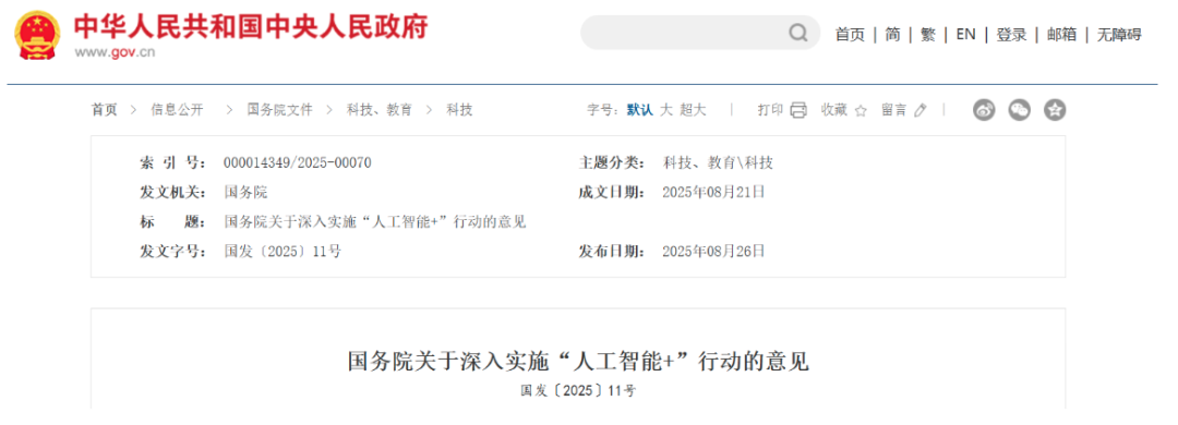 2025年8月国务院发布《关于深入实施"人工智能+"行动的意见》,《意见》是继2024年政府工作报告首次提出"人工智能+"行动后,国务院印发的首个系统性人工智能发展顶层设计文件,标志着我国人工智能发展从技术突破向全要素赋能的关键跃升。《意见》提出"三步走"战略目标:到2027年,率先实现人工智能与6大重点领域广泛深度融合,新一代智能终端、智能体等应用普及率超70%;到2030年,人工智能全面赋能高质量发展,应用普及率超90%,智能经济成为经济发展重要增长极;到2035年,全面步入智能经济和智能社会发展新阶段。《意见》明确六大重点行动领域:人工智能+科学技术、人工智能+产业发展、人工智能+消费提质、人工智能+民生福祉、人工智能+治理能力、人工智能+全球合作。《意见》从算力、数据、人才、安全等方面提出八大基础支撑措施,推进人工智能全学段教育和全社会通识教育,完善人工智能法律法规、伦理准则等。